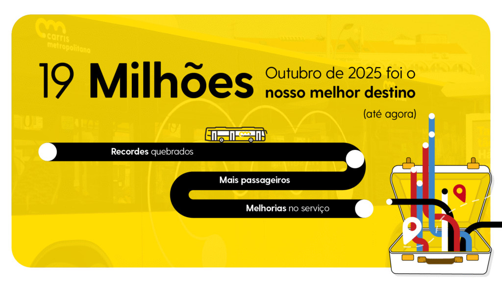 Com a melhoria contínua do serviço e o alargamento da oferta da Carris Metropolitana, cada vez mais pessoas escolhem o transporte público para as suas deslocações diárias. O impacto tem sido claro: só em outubro foram transportados mais de 19 milhões de passageiros, um novo marco que reflete a confiança e adesão crescente dos utilizadores — reforçada também pelo regresso às aulas e ao período escolar.