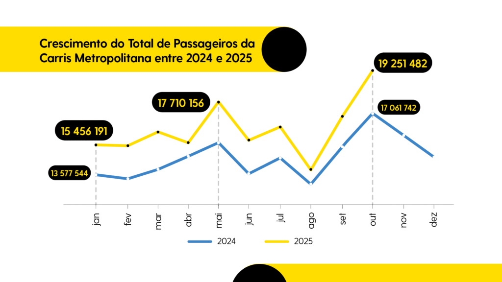 No ano passado, o número máximo de passageiros transportados num único dia foi registado a 10 de outubro, com um total de 688 mil passageiros, num mês em que tinha sido atingido um novo máximo de 17,1 Milhões de passageiros na amL. Um ano depois, o crescimento na procura do transporte da Carris Metropolitana superou novos marcos em outubro de 2025, com uma subida desse número para 19 Milhões passageiros.