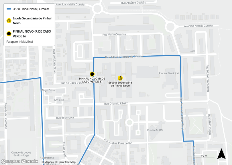 A linha passará a efetuar início e fim de percurso na paragem Pinhal Novo (R De Cabo Verde 6), junto da Escola Secundária de Pinhal Novo: