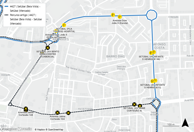 As paragens existentes ao longo do percurso antigo deixarão de ser servidas, passando a serem efetuadas 4 novas paragens em cada sentido no novo percurso. Consulte o novo percurso aqui.