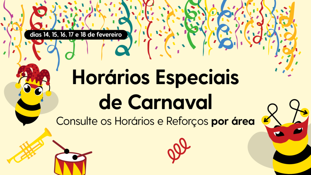 Na terça-feira de Carnaval, 17 de fevereiro, todas as linhas da área 1 adotarão o horário de sábado do período escolar, exceto as linhas 1626 e 1733 que terão horários especiais, e que já podem ser consultados no site oficial da Carris Metropolitana, no menu “Pesquisar linhas” introduzindo a linha e data de 17 de fevereiro.